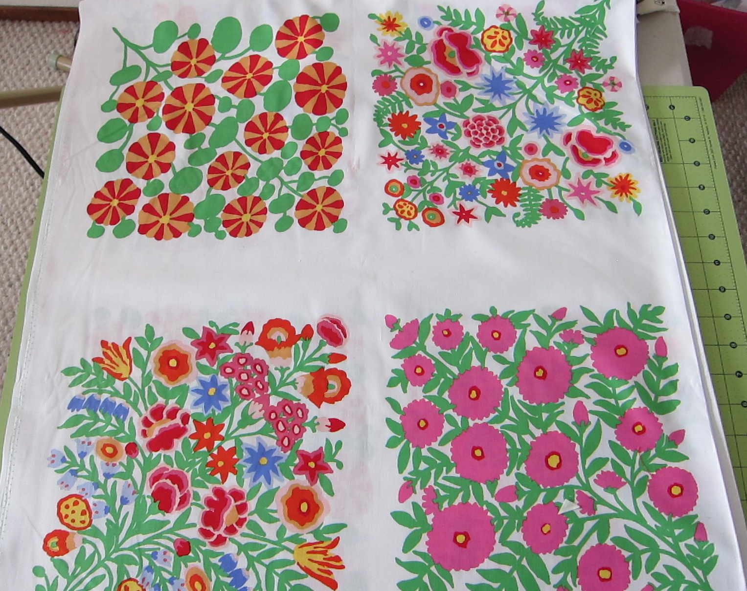 This top sat in the closet for a long long time. At one point I thought I might take the blocks out of the top and re-set them. Then I finally resolved to just quilt it, and I pieced a backing from some bright 60s-70s prints.